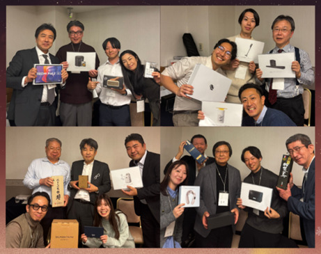 景品をかけた今年のゲームは幹事4人に関するクイズと曲当てゲームでした。曲当てゲームでは、懐かしいメロディーが流れるたびに、自然と声が上がり、会場は終始和やかな雰囲気に包まれていました。懐メロを次々に当てていくみなさんの記憶力と反応の速さは、本当にさすがでした!!